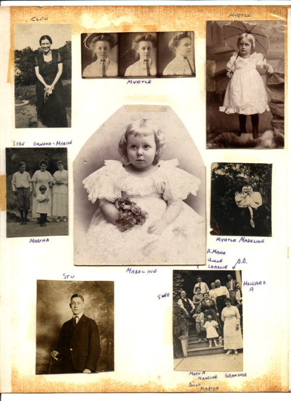 My favorite picture of my grandmother Madeline, whom I really don't remember (she died when I was 3), is in the center, and the same with Myrtle and her parasol upper right. I can almost hear Coe's chesty laugh in the photo upper left — it was unforgettable and utterly infectious — though I never knew her when she was so skinny. My grandfather Pop Bly (WJBlySr) appears in the upper right of the photo lower right — which means he must have been a-courting Madeline, if they weren't in fact already married.
