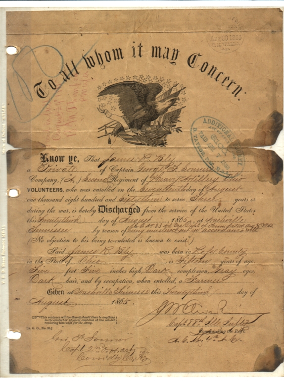 This is probably the oldest document in the archive, James R Bly's discharge papers from the Union Army at the end of the Civil War.